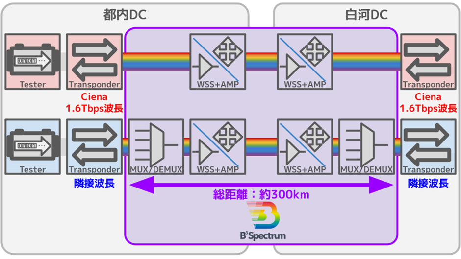 波長貸しサービス「B³ Spectrum」は、Alien Wavelength(他社信号)接続構成を実現し、多岐にわたるトランスポンダーとの接続検証を完了しています。通信の大容量化が進む中で、より大容量の伝送を実現するため、今回新たに大容量伝送が可能なCiena社製のトランスポンダー[WL6e]の実用性の確認を行いました。